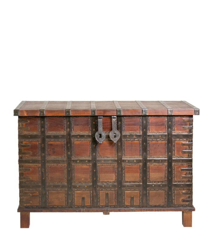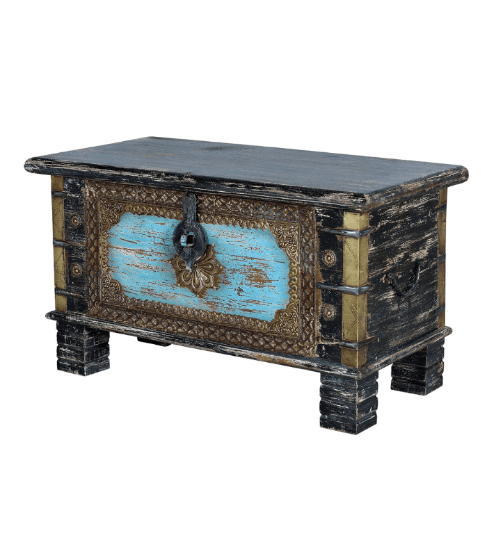 - Baúl vintage: Con herrajes antiguos y detalles tallados. Ideal para combinar con mesas de centro y sofás de líneas clásicas.