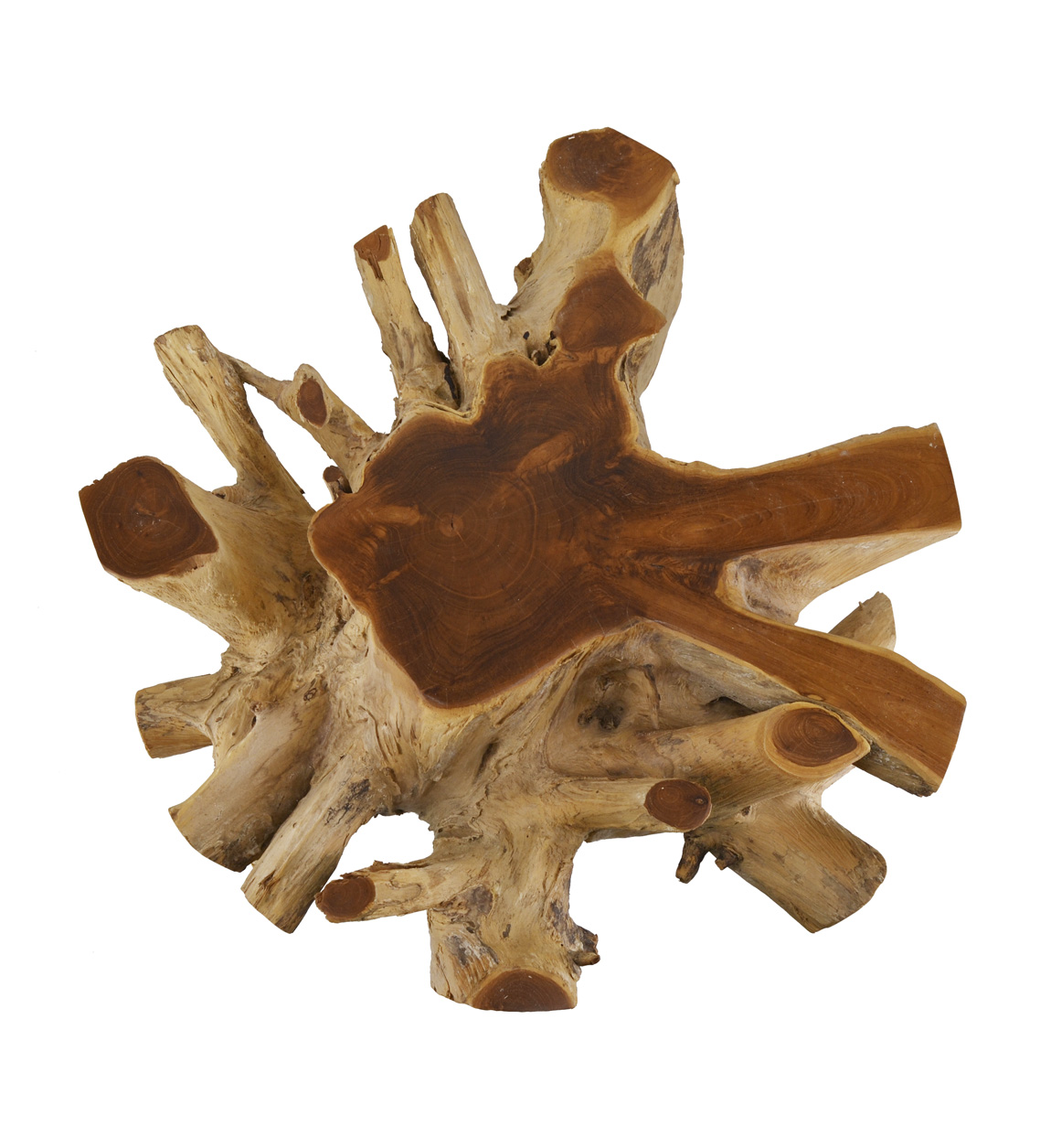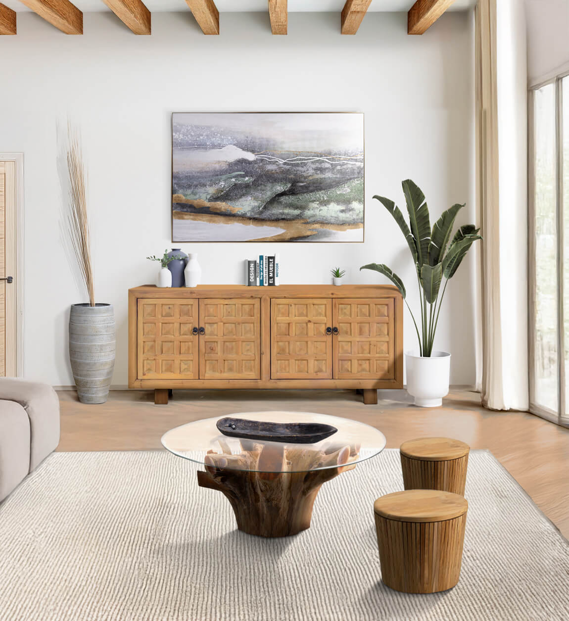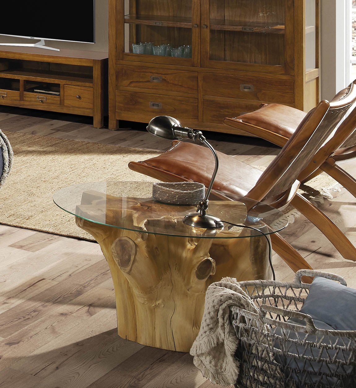 MESA CENTRO RAIZ TEKA BLANQUEADA CON CRISTAL 80x80x45