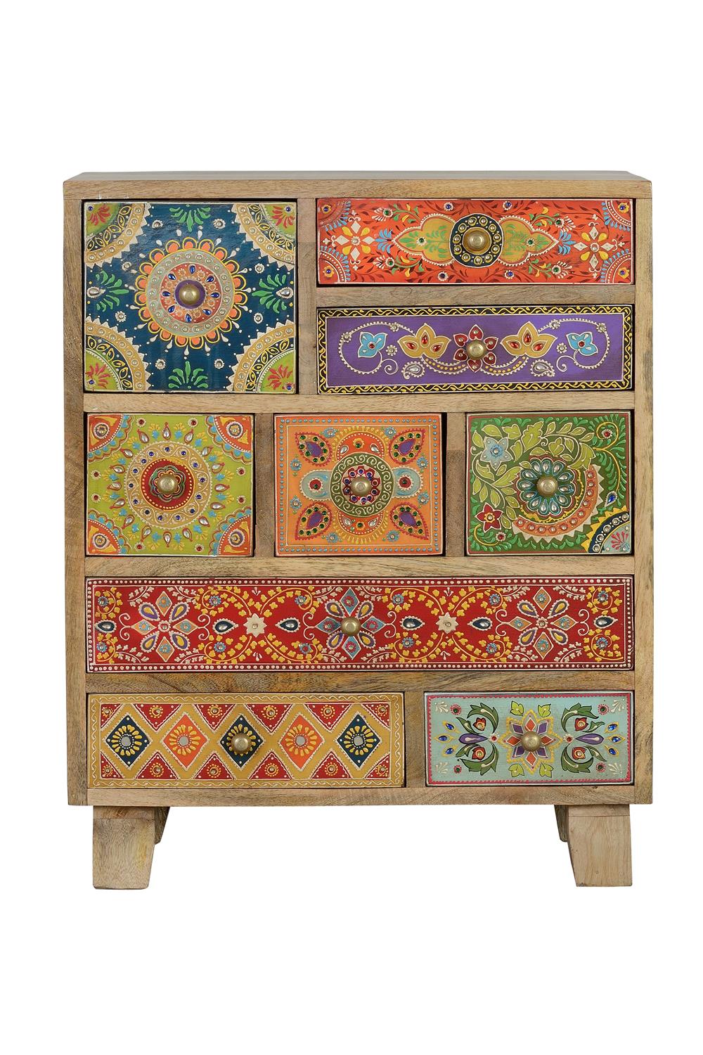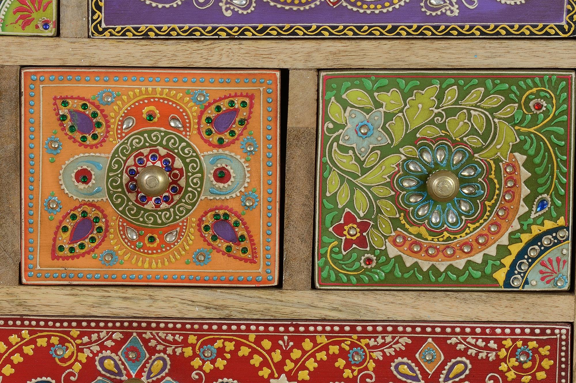 MUEBLE 9 CAJONES EN MADERA DE MANGO MACIZO, CON DETALLES PINTADOS A MANO.