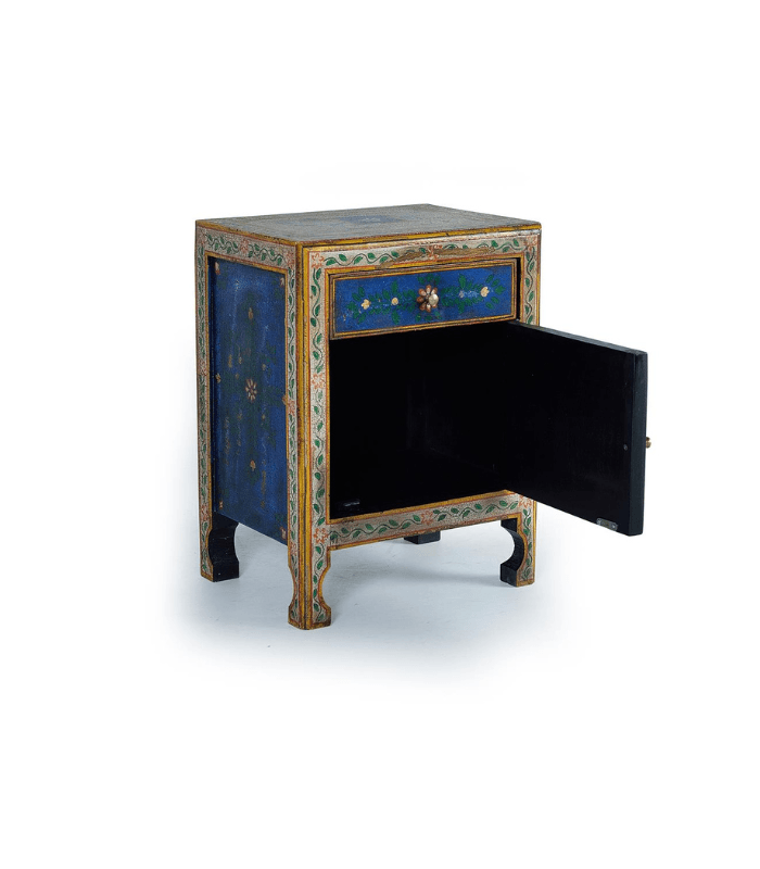 Mesita artesanal en madera de mango con detalles pintados a mano. Un cajón, una puerta, ideal como mueble auxiliar con personalidad.