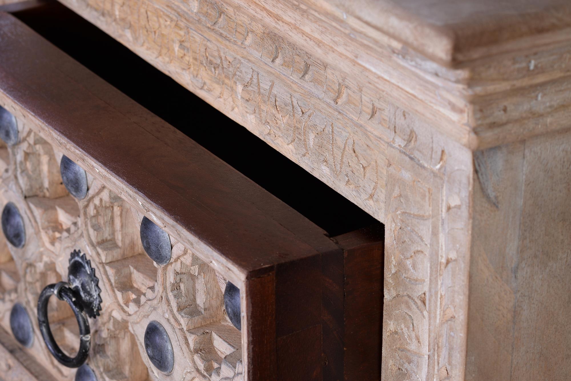 MESITA 2 CAJONES EN MADERA DE MANGO, DETALLES DE LAS PUERTAS EN HIERRO.