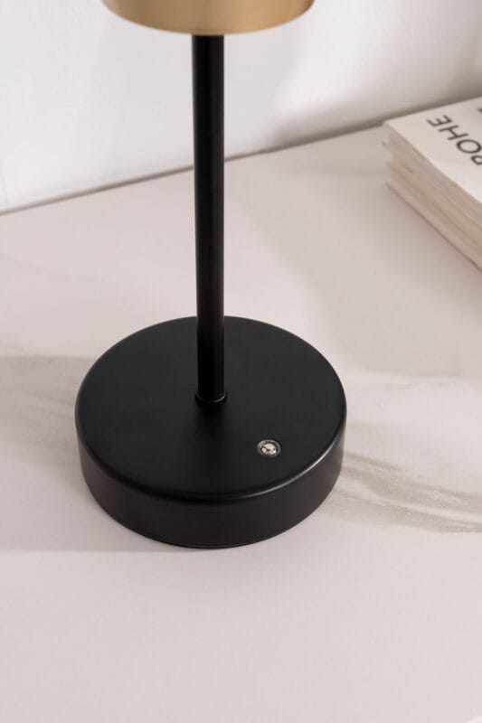 146,98 € IVA 21% Incl.LÁMPARA PORTATIL POUL DORADO Y NEGRO. 31×17 CM