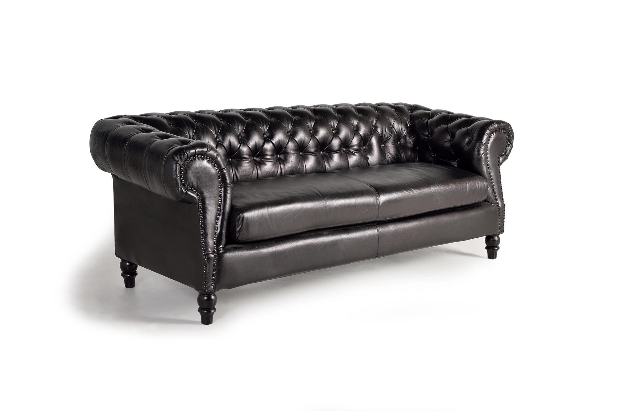 Sofá Chester negro de piel auténtica, 3 plazas, con estructura robusta y patas de madera. Estilo clásico y confortable.